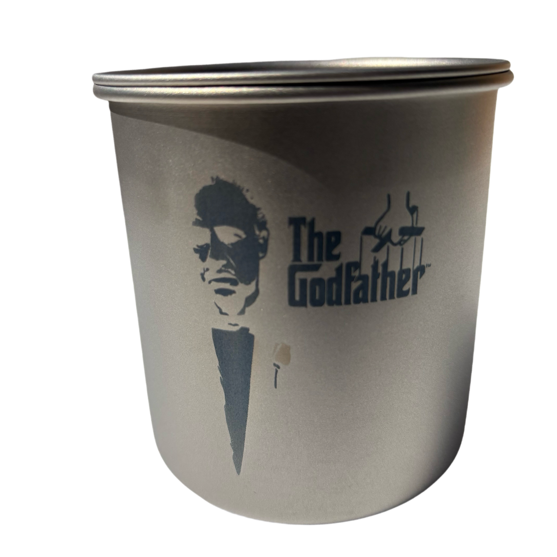 EtchStudio 420ml Pure Titanium Mug with Lid – The Godfather Theme, Ultralight, Durable, with Mesh Bag